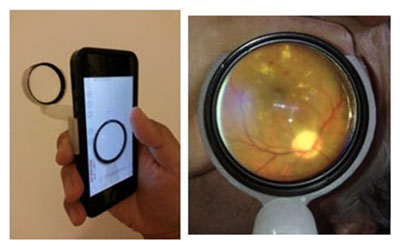 Caption: Ophthalmoscopy condensing lens mounted to an iPhone 5 and a fundus photo taken with the attachment.