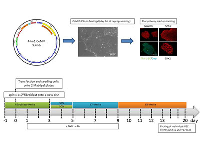 Stanford researchers developed a single plasmid reprogramming system called CoMiP carrying codon optimized sequences of the canonical reprogramming factors (OKSM) and short hairpin RNA against p53. They have successfully derived >10 different mouse and human iPSC lines from fibroblast of young and old subjects by performing a single transfection using either electroporation or Lipofectamine LTX. Together with an additional vector encoding for MYC, LIN28 and NANOG they were also able to reprogram blood derived PBMCs into iPSCs. The novelty of this system is that it is highly efficient, integration free, easy to use, and inexpensive to produce. Furthermore, the construct is color labeled and is free of any antibiotic selection cassette which might be beneficial for future application in regenerative medicine.
