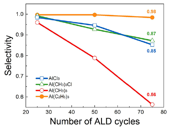 Photo description: Selectivity of ALD precursors as a function of cycles. Photo credit: Oh et al. Chemistry of Materials (2021).