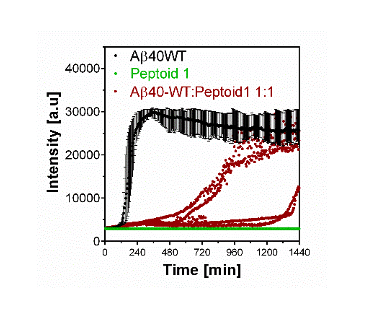 Figure Description: Thioflavin T (Tht) fluorescence measurements of the process of A? amyloid formation and A?:peptoid formation following A?40 fibril formation. (image credit: the inventors)