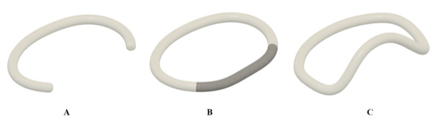 Researchers in the Woo Lab at Stanford have created a modular annuloplasty device that avoids suture placement in conduction tissue. Its most basic form is a C-shaped band with a wide gap between the two ends to avoid traversing over the septal leaflet. The device can be further secured by adding a flexible polymer that joins the ends of the device. Alternatively, the ends can be conjoined with a bridge-like structure that bends away from the valve. The bridge is angled to conform to the septal wall and aorta, improving retention.