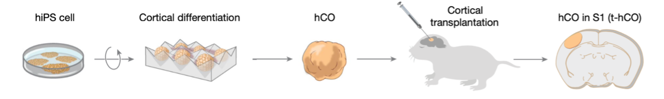 - hCOs are transplanted into rats at an early, plastic developmental stage favoring functional and anatomical integration of the organoids