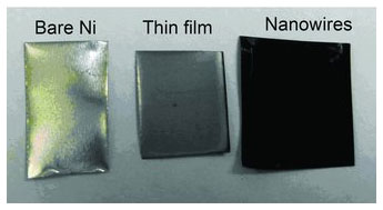 Photograph of three sample materials, showing a dramatic decrease in reflectivity of the nanowire sample - across wavelengths between 350-1100nm, the reflectance measured with an integrating sphere was 45-70% for Bare Ni, 20-40% for Thin film, and 1% for Nanowires.