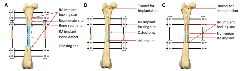 Schematic representation of the bioactive IM implant device for bone healing under three conditions. Blue color represents the hydrogel coating. White dots in the implant device represent porous structure. (A) Bone transport over an IM implant. Two ends of IM implant are anchored by two fixative pins. (B) Bone lengthening over an IM implant. The implant can be inserted through a bone tunnel. One end of IM implant is anchored by one fixative pin. (C) Non-union treated with an IM implant. Two ends of IM implant are anchored by fixative pins. (image credit: the inventors)