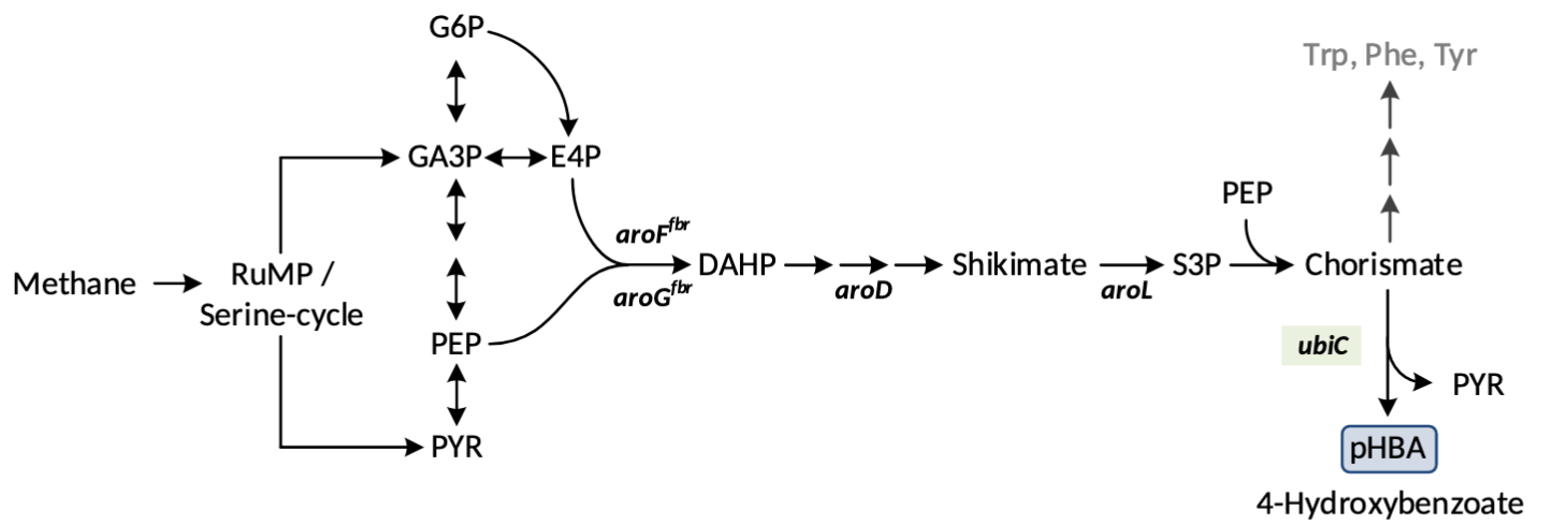 Biocatalytic production of para-hydroxybenzoic acid (p-HBA) from methanol and methane