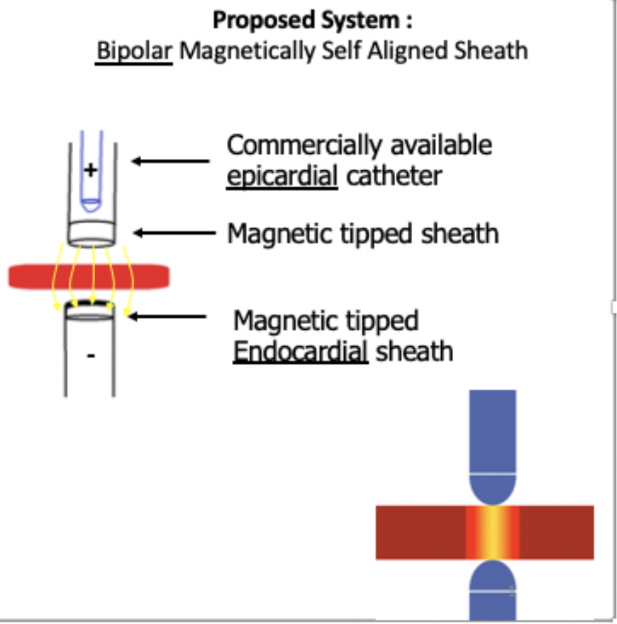 Stanford researchers have prototyped an electromagnet-based epicardial-endocardial alignment sheath for constant force bipolar ablation. This innovative catheter system creates full-thickness ablation during epicardial and endocardial ablation procedures while aligning tools perfectly on two sides of the heart using a set of magnets. Combining two separate standard procedures into one enhances ablation alignment and transmurality as well as saves time and costs.