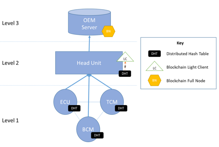 This three-layered architecture blends a DHT implementation with a blockchain implementation, to gain the benefits of both technologies without imposing undue computational burden on constrained compute modules (image credit: the inventors)