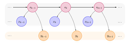 Figure 2 - An example graph theoretic implementation of a dynamical BMI. The BMI incorporates an underlying neural state, sk, which obeys dynamics and generates both the kinematics of the prosthetics device (xk) and the neural data observed (yk).