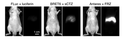 Bioluminescence of CyOFP fusion protein is superior to other reporters in living mice. The CyOFP fusion protein (Antares) with furimazine (FRZ) was injected into mice intravenously and compared with both BRET6 with coelenterazine (sCTZ) and firefly luciferase (FLuc2) with luciferin. Antares produced about 4x more detectable emission than BRET6 and about 18x more detectable emission than FLuc.