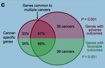 Figure C: Approximately 2/3 of prognostic genes (continuous Cox regression; P0.001) are prognostic in at least two cancers, while the remaining 1/3 are cancer-specific. Image credit -- inventor publication listed below