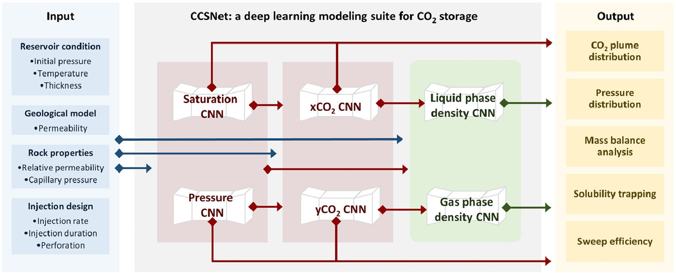Traditional simulators for carbon geological storage are computationally expensive and time consuming. Trained with a large numerical simulation data set, CCSNet provides numerous outputs for carbon dioxide storage projects including but not limited to CO2 gas saturation, pressure buildup, and mass balance.