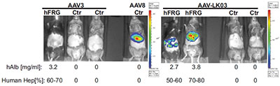 AAV-LK03 is selective for human hepatocytes in vivo. The newly engineered AAV chimera (AAV-LK03) selectively transduced human hepatocytes (in humanized FRG animals – hFRG) but not in non-humanized controls (Ctr). Conversely, the AAV3 vector did not transduce either type of mouse and the AAV8 vector was not specific for human hepatocytes (as shown by transduction of the Ctr mouse). Human albumin (hAlb) levels and estimated percentages of repopulation with human hepatocytes are given for each animal.