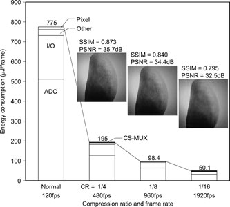 Stanford researchers have patented an image sensor that overcomes frame rate and power consumption limits for high-speed mega-pixel imaging, and therefore can extend battery life for mobile phone cameras. The image sensor uses compressed sensing (CS) to reduce the number of captured measurements, hence the number of Analog to Digital conversions performed, without adversely affecting signal. The prototype, a 256x256 0.15 μm CIS process image sensor, demonstrated no loss in Signal to Noise Ratio or sensitivity relative to normal capture, and close to linear reduction in energy consumption per frame with CS compression ratio. The sensor benefits cameras with high-frame-rate imaging and limited power sources.