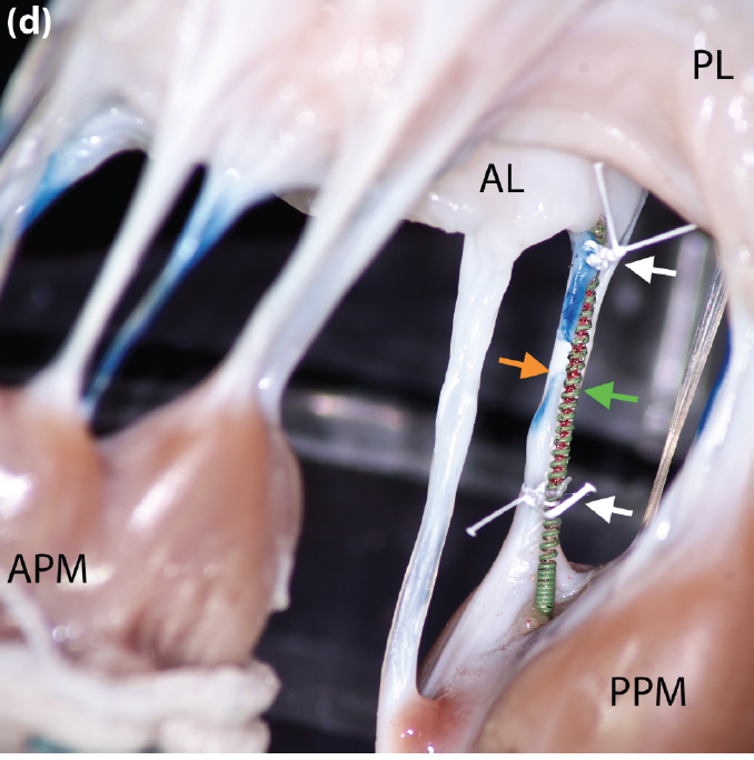 Prototype FBG-based force sensing nechord (green arrow) implanted ex vivo via suture (white arrow) to measure the chordae of interest (orange arrow). APM: anteriolateral papillary muscle; PPM: posteriomedial papillary muscle, AL: anterior leaflet.