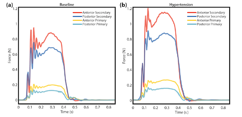 Force tracing of chordae tendineae at baseline (left) and during hypertensive conditions (right), demonstrating proper function of FBG sensor.