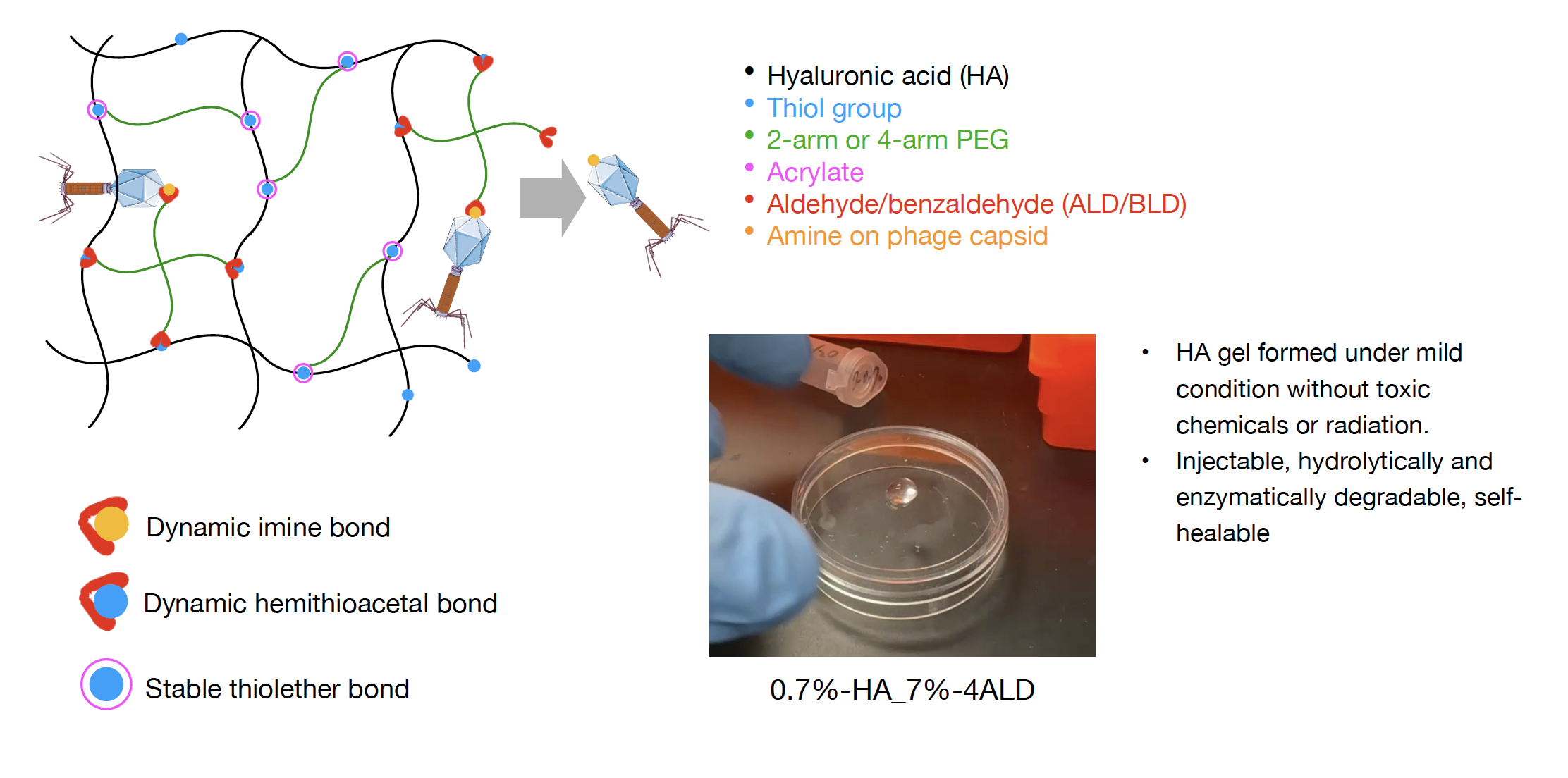 Stanford researchers have developed aldehyde-containing hydrogels that release bacteriophage, with or without antibiotics, over a controlled and sustained manner to treat infections including orthopedic joint infections, wound infections, ear infections (chronic suppurative otitis media), and osteomyelitis.