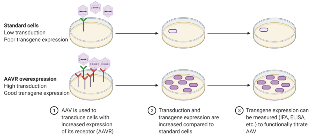 Adeno-associated virus (AAV) vectored products are currently leading candidates for gene therapy applications with multiple approved products and many more in clinical trials. While AAV has been successfully used for gene delivery for many years, the receptor for this virus was only recently discovered (Pillay, 2016). The multi-serotype AAV receptor (AAVR) has been shown to be critical for transduction both in vitro and in vivo for most AAV serotypes including the major serotypes used in the clinic. Overexpression of AAVR has also been shown to increase transduction in vitro for multiple AAV serotypes that are known to poorly transduce cells. This finding has allowed for the development of cells that can be used to functionally titrate AAV serotypes where it was previously difficult or impossible.