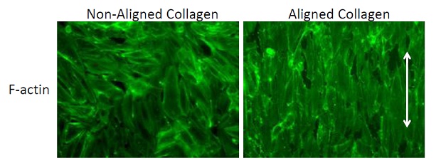 Figure Description: Endothelial cell morphology on aligned nanofibrillar collagen. Immunofluorescence staining of phalloidin (green) staining of cytoskeletal protein F-actin. Arrow denotes direction of collagen fibril assembly.