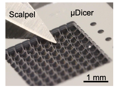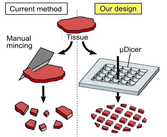 Stanford researchers in The Tang Group have developed a reproducible, high throughput device that dices tissue into uniformly sized sub-millimeter sample fragments. Commonly used manual mincing (figure 1) produces samples of varying sizes (figure 3) with potentially unwanted variations in subsequent assays. The Tang Group's "?Dicer" (figure 2) quickly and reliably generates uniformly sized 100-300 ?m fragments. Researchers fabricated prototypes from 500-micron thick silicon wafers, and then tested the prototypes with soft material and tissue. Device optimization is ongoing, especially for dicing cancer tumors and other tissues, and capturing the fragments for spatial-omics research. Ultimately, the ?Dicer will facilitate tissue sample preparation for applications like genetic screening, drug screening, and spatial-omics.
