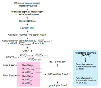 As an alternative approach, Stanford researchers developed a software called QUARTZ (QUAntification of Rearranged Targeted Zone) to estimate whole-body turnover of T and B/plasma cells using blood samples. QUARTZ analyzes sequence data of cfDNA in blood plasma that is typically disregarded due to high noise in sequencing depth. It uses selectors to target maximal rearrangement regions within immune receptor loci and derives sequencing depths at these regions. Then, the depths are corrected using GC bias correction and Gaussian process regression (GPR), enabling accurate estimation of lymphocyte subset fractions. Additionally, QUARTZ includes non-T and B cell control data derived from healthy individuals as reference, supporting comprehensive assessment of immune status.
