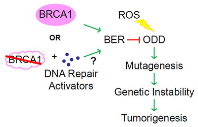 BRCA1- mediated Tumorigenesis and Prevention. Oxidative DNA damage (ODD) is induced by reactive oxygen species (ROS) and removed by the base-excision DNA repair pathway (BER). ODD, if left unrepaired, leads to mutagenesis, genetic instability, and tumorigenesis. BRCA1 activates BER, reduces levels of ODD, and thus, has been implicated in preventing tumorigenic events. When BRCA1 is mutated, DNA repair-activating drugs may enhance BER and prevent tumorigenesis.