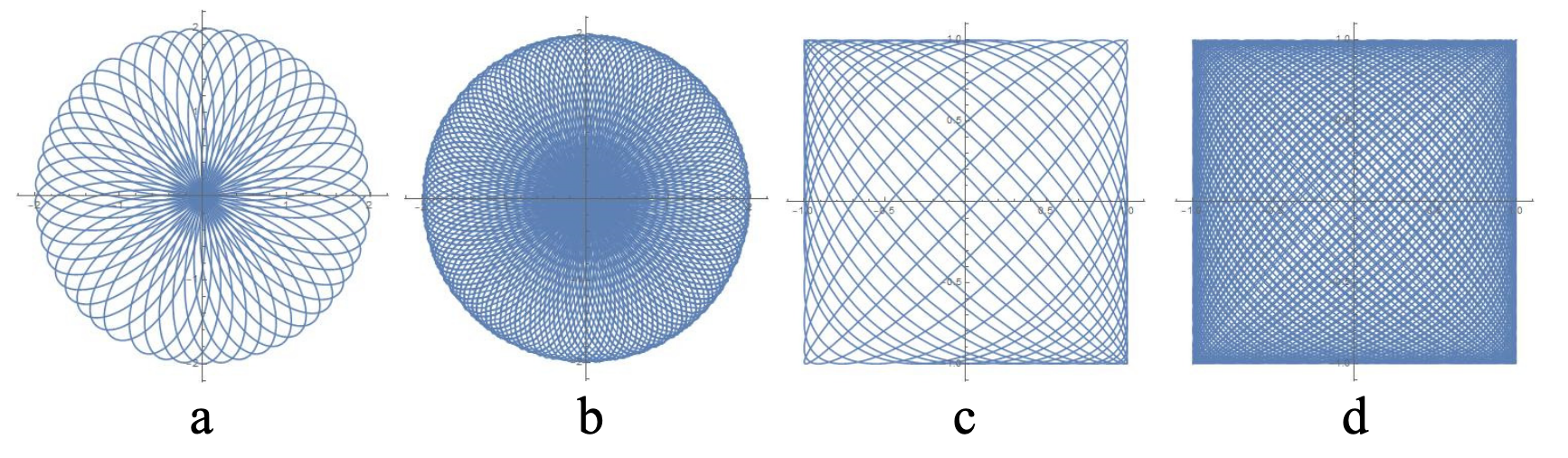Comparison of Rose and Lissajous curves. (a) 16 full loops of Rose curve (b) 80 loops of the same Rose curve as in a. (c) 16 full loops of Lissajous curve. (d) 80 loops of the same curve as in c. Images courtesy of Jennifer Solgaard and Olav Solgaard.