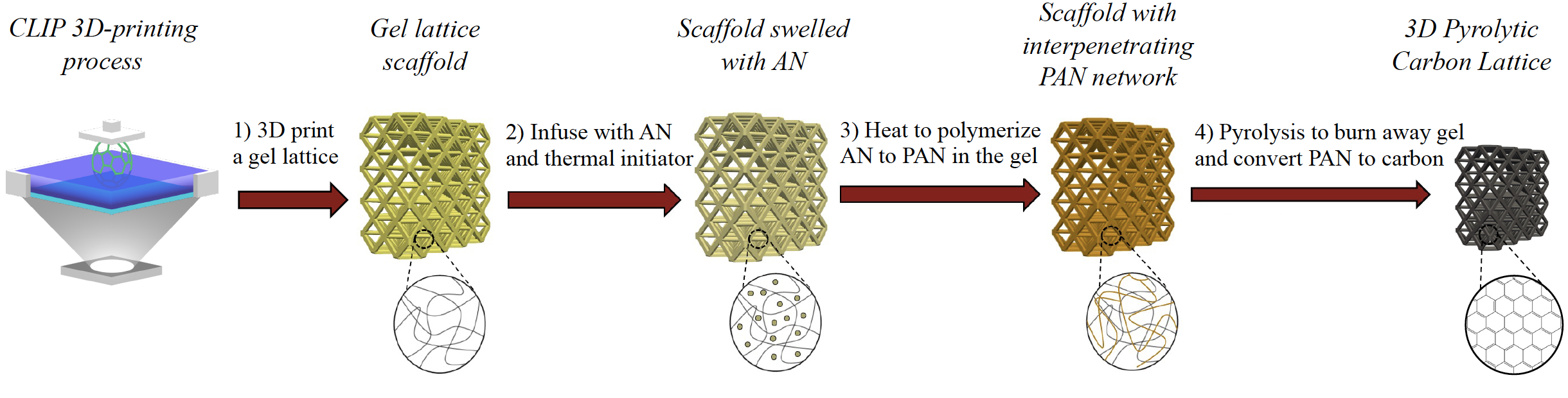 The DeSimone Research Group at Stanford University developed a method for fabricating 3D pyrolytic carbon structures from polyacrylonitrile (PAN) generated by a scalable Vat Polymerization 3D-printing continuous liquid interface production (CLIP) process. PAN is popular for generating conductive high-strength carbon fibers commonly used in lightweight structural applications including battery systems for sustainable energy storage. However, because PAN is insoluble in its own AN monomer, it precipitates to form powder during VP 3D printing making it impossible to print. In response, the DeSimone Research Group developed this multi-step fabrication method for producing 3D carbon structures from PAN (See Figure below):