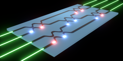 Figure description - Researchers have shown a neural network can be trained using an optical circuit (blue rectangle in the illustration). In the full network there would be several of these linked together. The laser inputs (green) encode information that is carried through the chip by optical waveguides (black). The chip performs operations crucial to the artificial neural network using tunable beam splitters, which are represented by the curved sections in the waveguides. These sections couple two adjacent waveguides together and are tuned by adjusting the settings of optical phase shifters (red and blue glowing objects), which act like 'knobs' that can be adjusted during training to perform a given task.