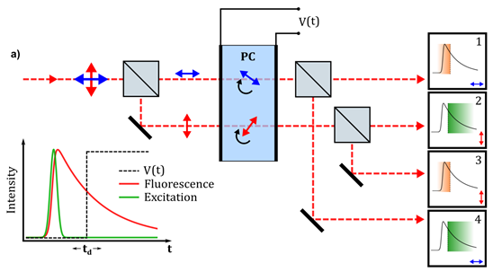 Figure description- A) Schematic of Pockels cell detection with two temporal bins. Input from an imaging system (pulsed excitation and fluorescence from a microscope is drawn) is split by two polarizing beam-splitters before and after Pockels cell. All emitted photons are captured in four spatially separated images on any standard detector. Image intensities on the sensor encode temporal information from the Pockels cell modulation. Any modulation V(t) may be applied.
