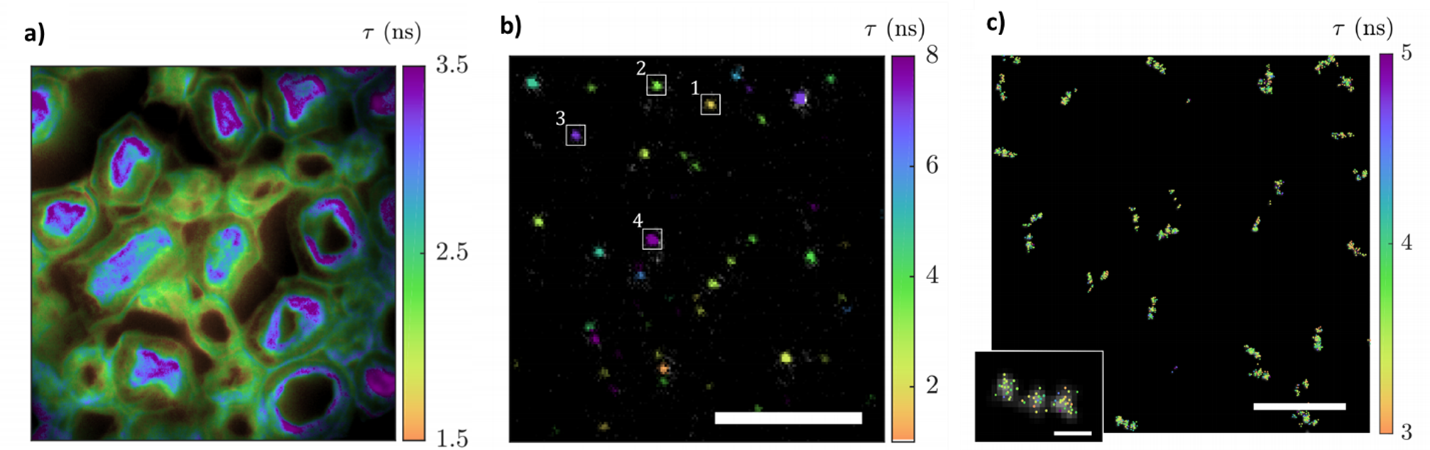 Figure description- Wide-field FLIM Examples: (a) FLIM image of a mouse kidney slice differentiating two fluorophores by lifetime (b) Single-molecule FLIM image on a mixture of molecules having different lifetimes – dynamics for each molecule may be observed at high frame-rate (see Publications) - 10 µm scalebar (c) Combination of FLIM and single-molecule super-resolution microscopy. Lifetime is measured for each single molecule burst and plotted at the localization coordinate (1 µm scalebar, 100 nm inset)