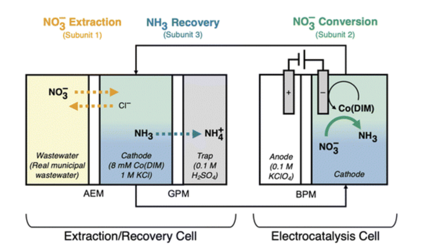 The Electrocatalyst-in-a-box (ECaB) performs three key processes: wastewater nitrate extraction, nitrate conversion to ammonia, and ammonia recovery. ECaB consists of two reactors (extraction/recovery cell and electrocatalysis cell), four recirculating electrolyte reservoirs (wastewater, catholyte, anolyte, and trap), and two applied potential conditions (open circuit and –1.05 VAg/AgCl). At small scale, it effectively and efficiently processes agriculture wastewater at atmospheric temperature and pressure. It is integrable with renewable energy sources – making it highly beneficial for sustainable environmental and industrial applications.