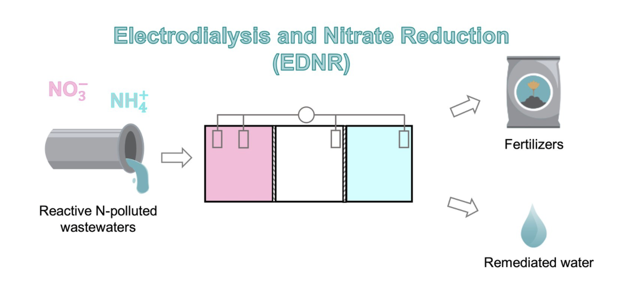 Stanford researchers have developed an Electrodialysis and Nitrate Reduction Process (EDNR) that produces high-purity ammonia from agricultural runoff. EDNR uses electrochemical bias switching for ion transport and nitrate reduction, and an electrochemical membrane reactor with electrocatalysts capable of oxygen evolution and nitrate reduction to concentrate nitrate and ammonia, reduce nitrate to ammonia, and recover alkaline ammonia from various wastewaters.