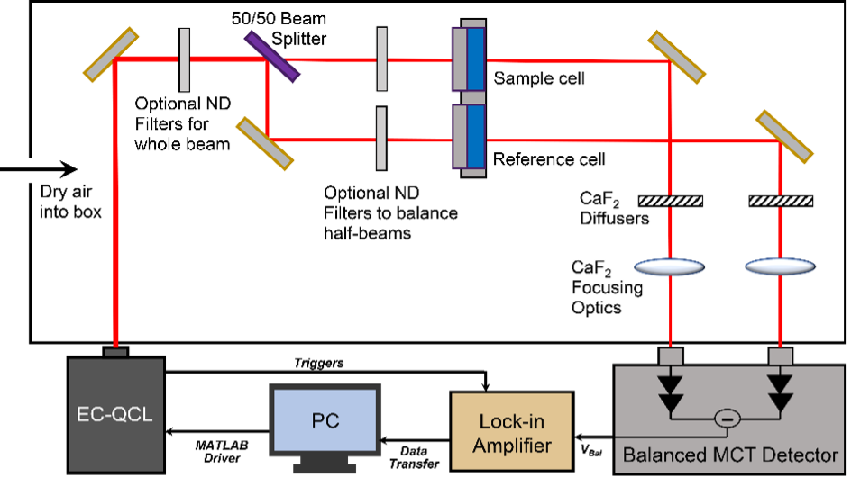 Figure Description: Instrument block diagram for the double-beam, QCL-based mid-IR spectrometer.