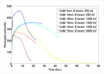 - The photocathode material can be changed to CsI, or other alkali material combination. Other electron beam energy or CsBr thickness may be utilized.