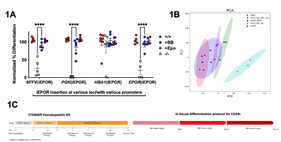 Results & Discussion: We first optimized iEPOR constructs through a highly effective signal peptide present on IL6 and inclusion of the naturally occurring intracellular domain truncation known to enhance erythropoiesis. Together, these modifications allowed us to drive HSCs to 100% differentiation into RBCs in the presence of the iEPOR-dimerizing small molecule. However, we also observed 26.2% differentiation in the absence of any endogenous or exogenous erythroid-biasing ligand. To increase the fidelity of our iEPOR, we integrated our iEPOR at the CCR5 locus and drove expression using the PGK promoter to ablate ligand-independent differentiation (Figure 1A). This identical HSC response to iEPOR in the presence of our small molecule versus native HSC in the presence of EPO was corroborated not only by flow cytometry-based markers of erythroid differentiation but also via HPLC-based assessment of hemoglobin A and F production. iEPOR-integrated HSCs differentiated as described clustered with natively differentiated HSCs vs undifferentiated HSCs by PCA covariance plots and differential gene expression heatmaps (Figure 1B). We observed effectively identical counts of hemoglobin RNA supporting our HPLC findings. Finally, we integrated our optimized iEPOR construct into an iPSC line and devised a consolidated, differentiation strategy from induced pluripotent stem cells to HSCs and, ultimately, RBCs (Figure 1C). Together, this proves our approach serves an ex vivo, EPO-independent RBC production strategy that closely mimics native EPOR signaling by surface biomarkers, relevant protein output, and transcriptional profile. By our calculation, 1nM of dimerizer is approximately 500-fold less costly than 3U/mL of EPO cytokine. This would therefore reduce the cost of EPO cytokine required to generate a single unit of RBCs from $2,760 to approximately $6. Given that dependence on costly cytokines is a common barrier to production of cell-based therapeutics, in the future we believe the strategies defined in this work may enable scalable and renewable ex vivo production of a wide variety of clinically relevant cell types including platelets, neutrophils, T cells.
