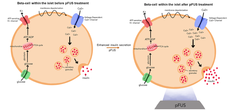 Figure description - Schematic representation of how pFUS can stimulate insulin secretion from ?-cells within pancreatic islets : pFUS enhances insulin secretion by enhancing intracellular calcium levels within ?-cells which then triggers the release of insulin granules via exocytosis.