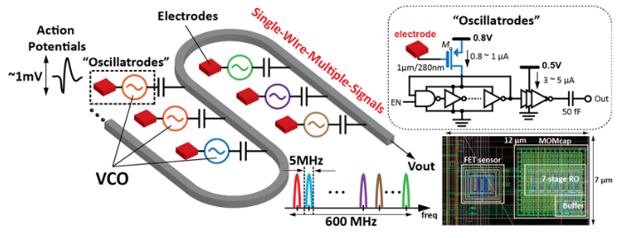 Multiplexing of many electrodes for brain neuron sensing is extremely difficult due to the requirement of using very little physical space. An array of "oscillatrodes" (oscillator-under-electrodes) are distributed along a probe and the outputs are coupled and transmitted using a single wire to overcome the space limitation. One application is for brain machine interface (BMI) to help paralysis patients regain functionality for improved quality of life.