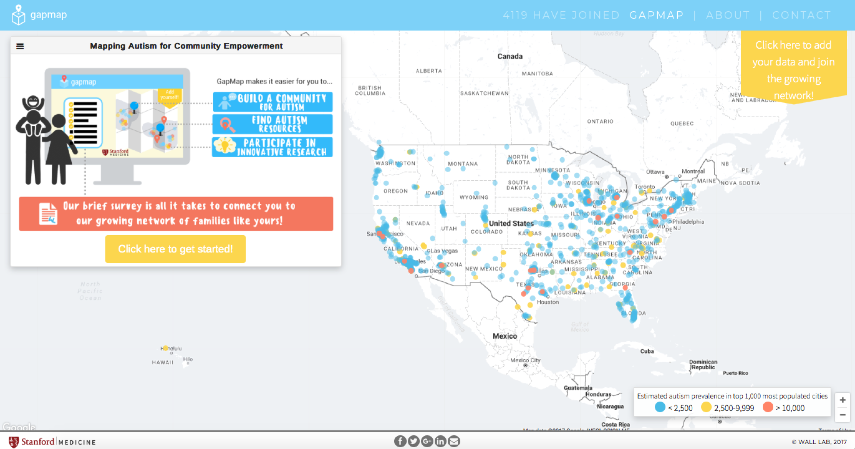 Stanford researchers have developed a software tool called GapMap that contains one of the most robust resource databases for families with autism, compiled via exhaustive machine-learning methods, and highlights gaps in clinical services. Using crowd-sourced input from the autism community, GapMap prospectively captures valuable demographic and behavioral data from users while also displaying local and validated resources and therapies. Its real-time, prevalence map for autism advocates the expansion of medical services and catalyzes telemedicine development and other remote technology to bring care to patients.