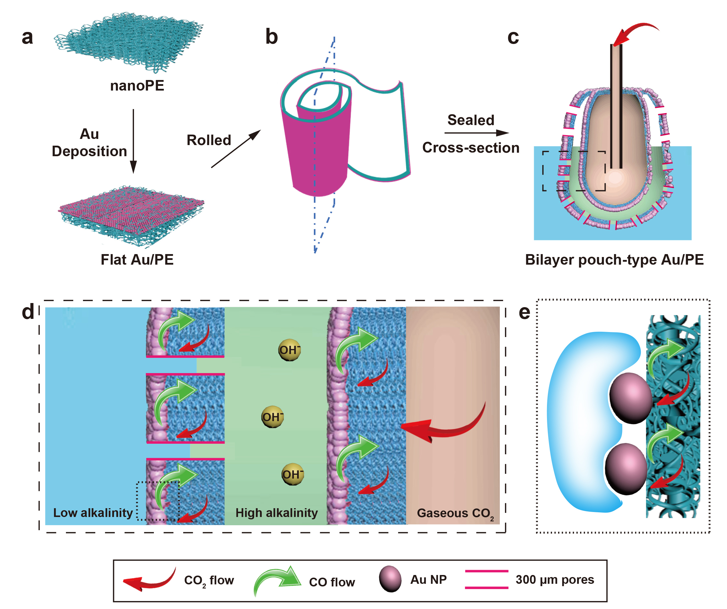 Schematics of the lung-inspired system for efficient electrocatalytic CO2 reduction. A layer of Au catalyst is sputtered on a nanoporous polyethylene membrane (nanoPE), the Au-coated PE membrane is rolled up and sealed into a bilayered structure mimicking a human lung. CO2 gas is delivered to the central compartment of the Au/PE membrane. Electrochemical reduction takes place on the electrolyte-catalyst-gas interface while the penetration and reduction of water molecules are inhibited. By varying the catalyst, this basic structure and function can also enhance performance of oxygen reduction, oxygen evolution or other reactions.