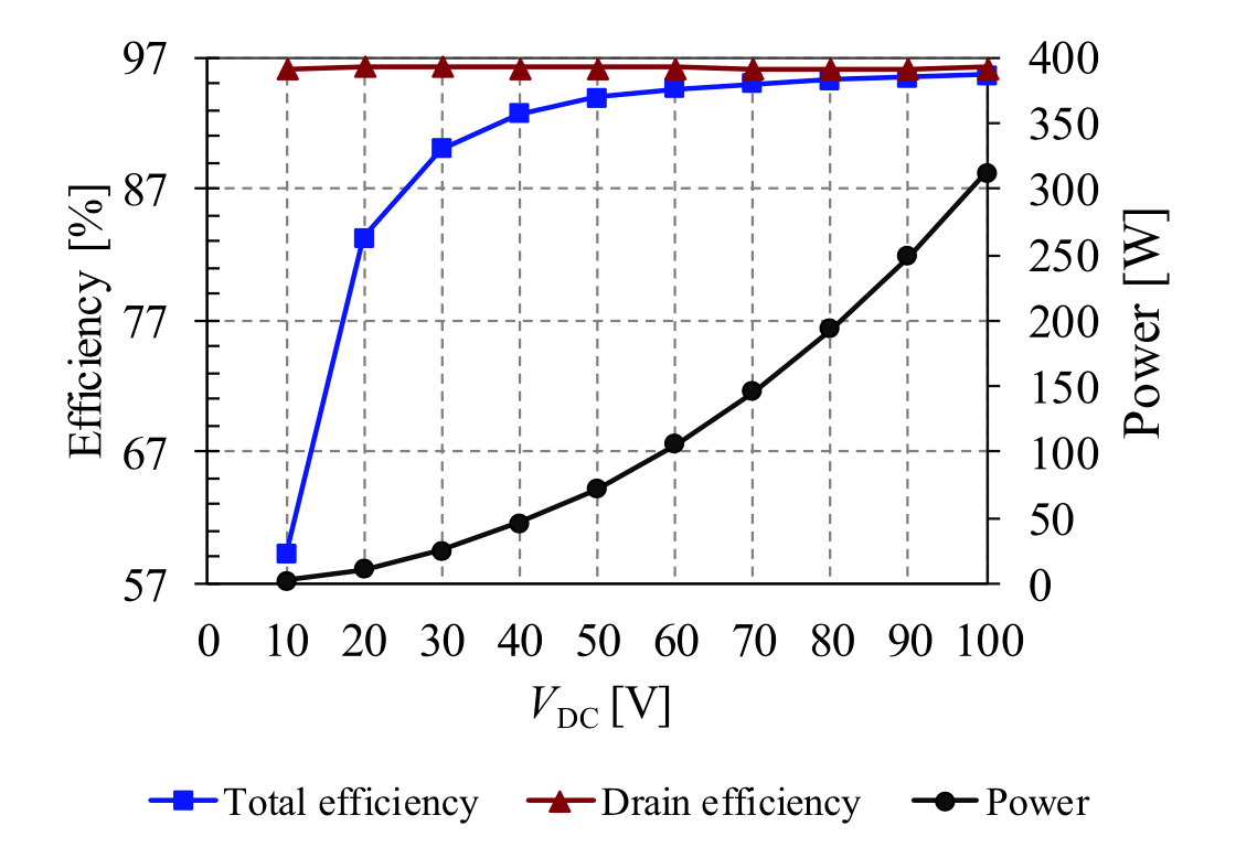 The SUPER Lab built and tested a 6.78-MHz 300-W series stacked push–pull ?2 amplifier with a T-network ("PPT ?2" amplifier prototype figure 1) that reached 96% peak total efficiency and high efficiency across a wide range of voltage and power (figure 2). Future performance improvement plans include incorporating recent innovations in wide bandgap (WBG) power semiconductors. Using this amplifier topology, the SUPERLab built and tested a 6.78-MHz 1.7-kW wireless charging system that reached a 95.7% dc-dc efficiency for an electric car, with an ongoing effort of pushing the power beyond 5 kW.