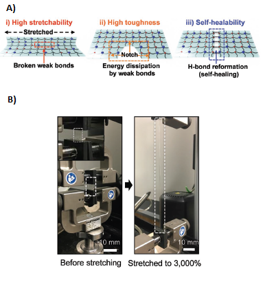 Figure description - Figure A. Schematics of a stretched polymer film (left), notched film (middle), and healed film (right). Figure B. The film before stretching (left) and showing high stretchability at 3000% stretching (right) in Instron machine.