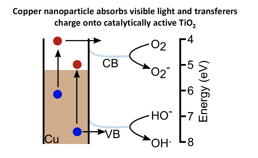 Figure description:Copper core absorbs light, and electrons are excited into higher energetic states, leaving behind holes. Electrons and holes are then transferred onto TiO2. TiO2 reduces CO2 into solar fuels and industrially useful chemicals (methanol, methane, ethylene). TiO2 also produces reactive oxygen species (ROS), which can remove contaminants in water.