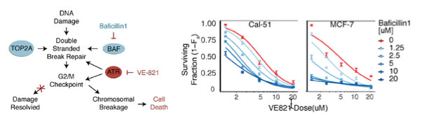 Mode of action - Results suggest that selectively inhibiting BAF complexes in the presence of ATR inhibitors forces cells into mitotic catastrophe and subsequent cellular arrest. Therefore, this may serve as a viable therapeutic strategy in certain cancers. In particular, the new BAF inhibitors could sensitize aggressive, high-mutated, or potentially drug resistant cancers to a host of chemotherapeutics. This strategy may be effective not only in cancers that have acquired BAF complex mutations, but also in highly mutated cancers which have evolved mechanisms to bypass important DNA damage checkpoints. Since Baficillin1 is not toxic, synergy studies suggest that they may enhance ATR inhibitor activity without additional toxicity to patients.