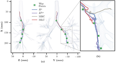 Feedback control in phantom lung navigation - (a) position traces of the distal tip of the robot for each of the control methods. (b) 3x magnification of the left inferior lobe.