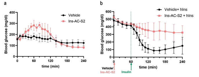 (a) Ins-AC-S2 alone disrupts blood glucose regulation by suppressing insulin receptor activation. (b) In mice, Ins-AC-S2 treatment leads to insulin resistance, as shown by a suppressed glucose-lowering effect of insulin compared to a vehicle control.