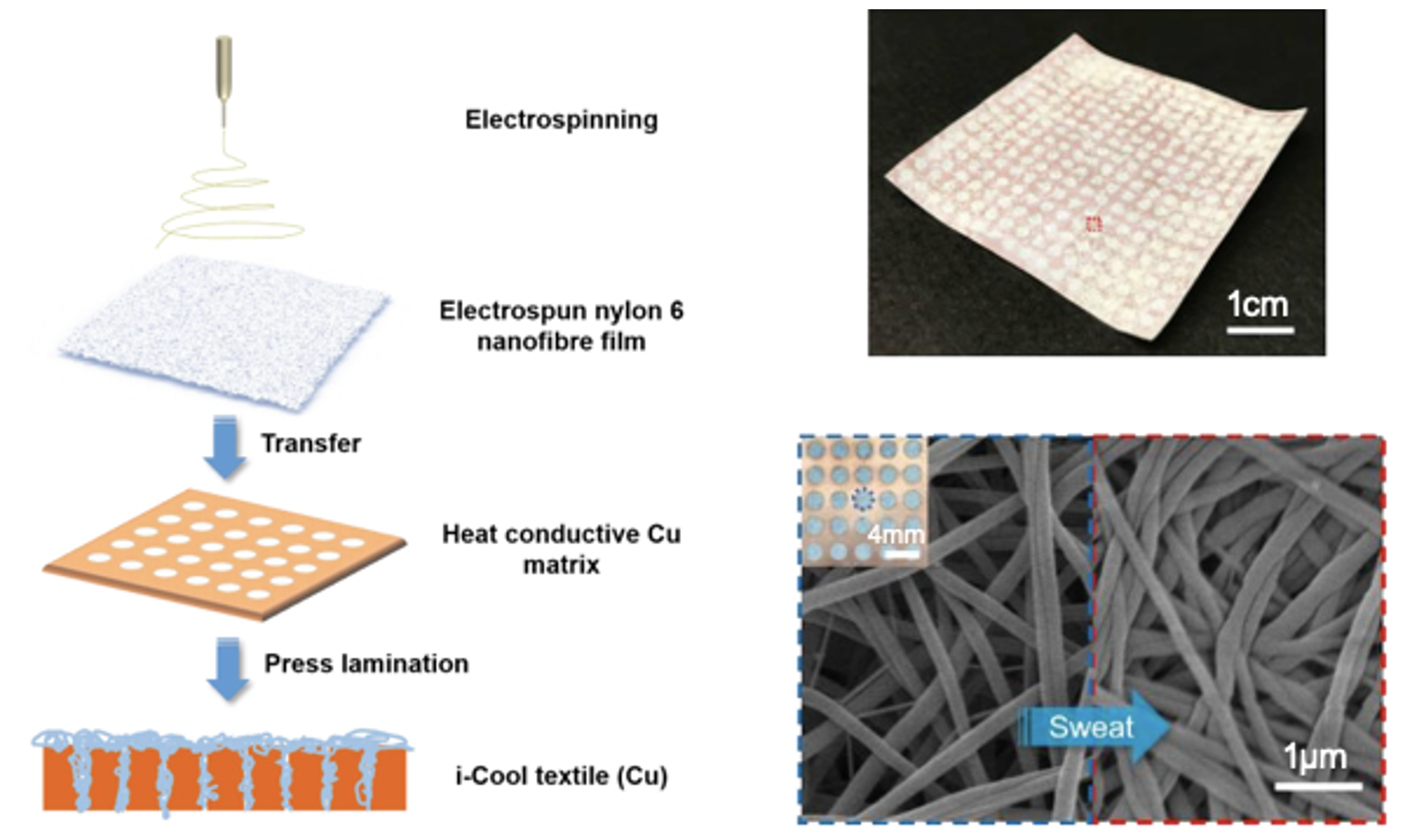 Stanford researchers have created an integrated cooling textile (called i-Cool) with an unique functional design for personal perspiration management (PPM). The novel structural design of i-Cool textiles incorporates lab-proven functionality for PPM: fast water wicking, rapid evaporation, superior cooling effect and suppressed human body dehydration, most of which current textiles do not achieve. An artificial sweating skin platform with feedback control loop simulating human body perspiration situation was realized, on which the i-Cool (Cu) textile shows apparent cooling effect and much less water loss compared to the conventional textiles. Also, the structure advantage maintains under various exercise and ambient environments. The practical application of the i-Cool design principles has also been demonstrated, exhibiting good performance and wearability. This i-Cool textile has the potential to revolutionize next generation textiles for PPM in the near future.