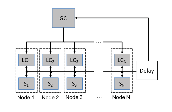 Figure 2 - Data flow in a distribution system. N customers with net loads S and local controllers LC. The local controllers communicate their data to a global controller GC, subject to a delay. The GC sends back control signals to the LCs based on the delayed information and its knowledge of the distribution network.