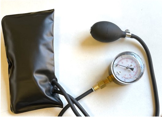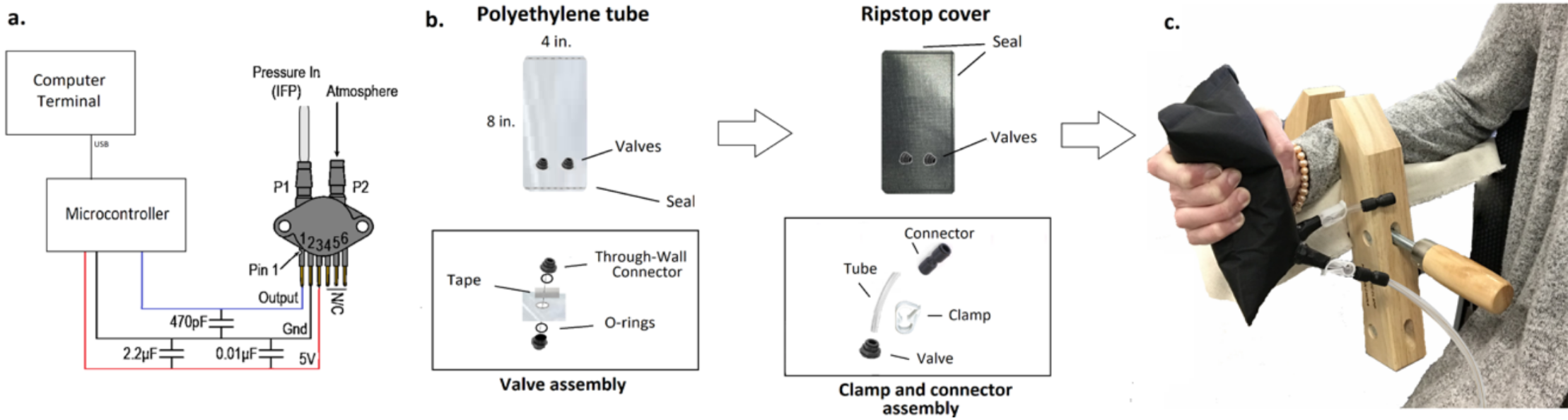 Figure 1 description - a. Schematic of the IFP electronics. b. Assembly of the IFP. c. The isometric force pillow used in a gravity-neutral position. The tube leads to the pressure sensor of 1a. The other valve is clamped after initial inflation using a hand vacuum pump.