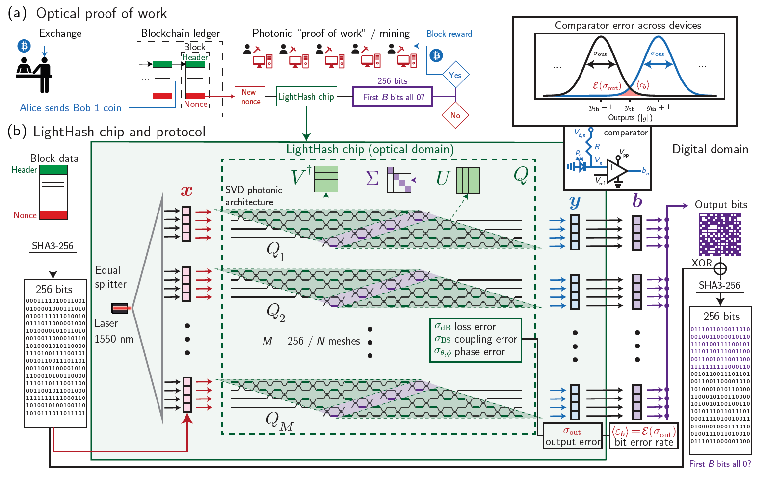 Figure Description:The LightHash protocol for optical proof of work - a) conceptual illustration and b) chip design.