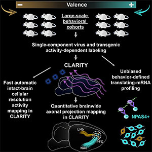 The inventors have demonstrated the utility of this technology by combining the high-throughput CLARITY pipeline with the axonal projection mapping to analyze the wiring of the prefrontal cortex in mice. These studies illuminated the logic of information processing in the brain by linking activity during behavior with the molecular properties of neurons.